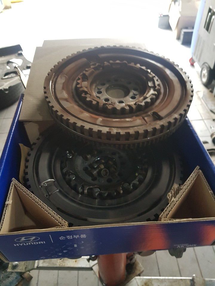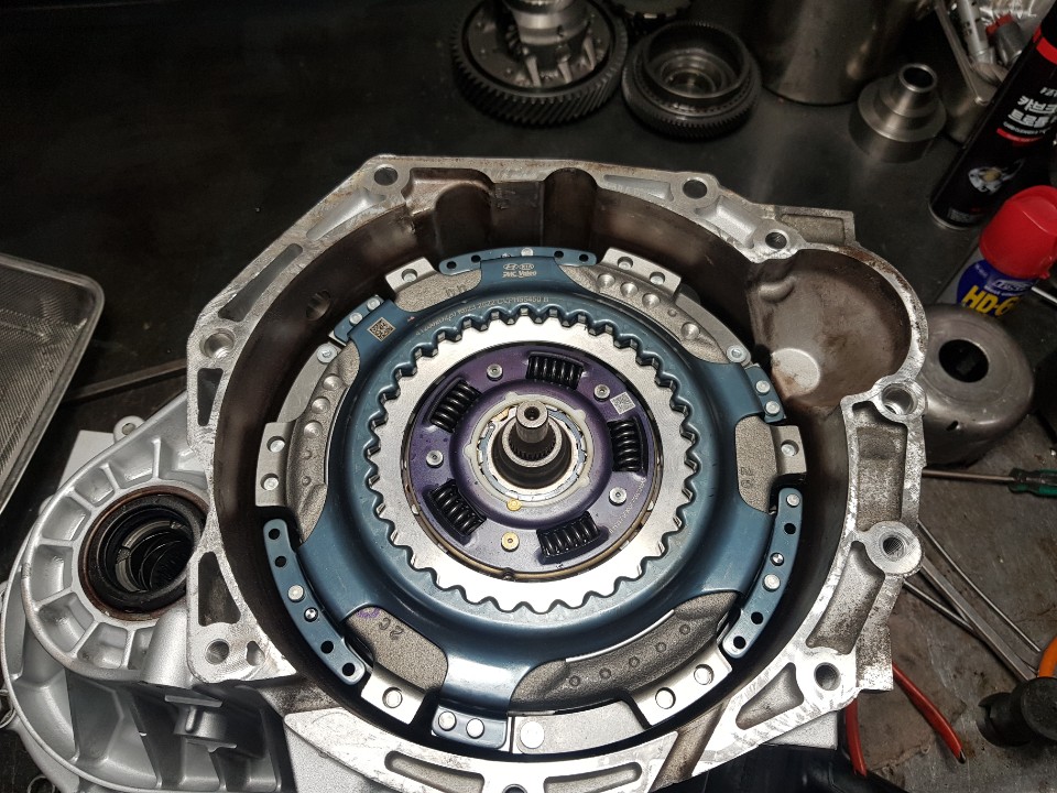 그리고 마지막으로 클러치~~^^ 하나 더 이 차량은 DCT 수동에 가깝다고 했죠~~^^ 그래서 토크컨버터가 없고 엔진에도 체결되는 토크컨버터 볼트도 없이 클러치가 이렇게 맞물려있습니다.